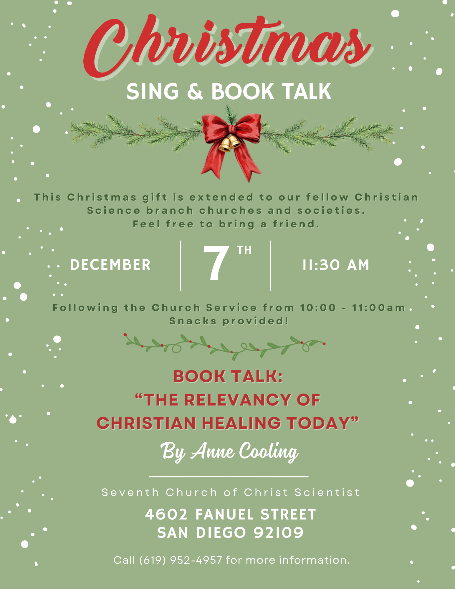 A Book talk “THE RELEVANCY OF CHRISTIAN HEALING TODAY” will be presented by Anne Cooling at the Pacific Beach Church December 7th at 11:30am